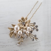 おしゃれ花嫁に人気のエリザベスバウアー(Elizabeth Bower)のヘッドピース。マットゴールドに美しいスワロフスキーとパールが上品。さりげないアクセントに。