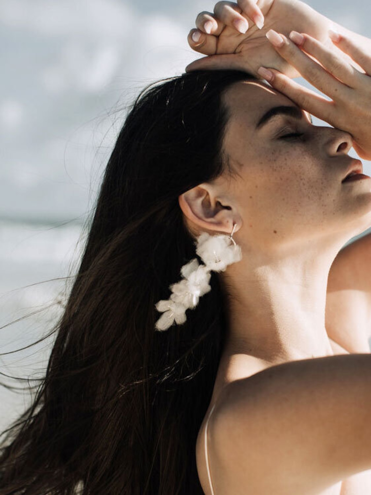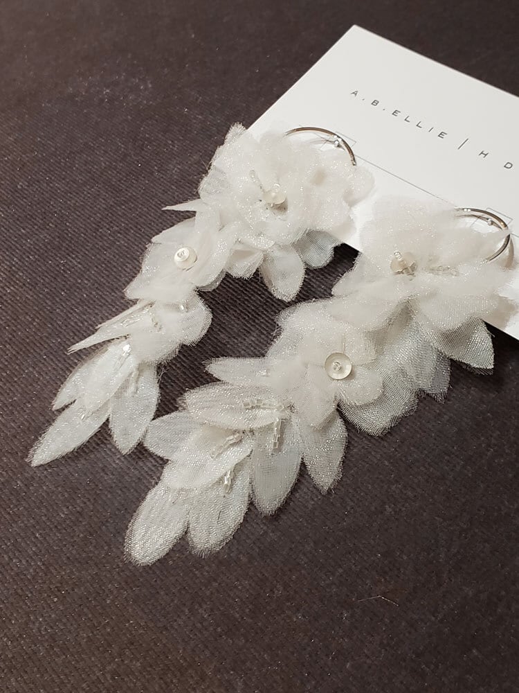 おしゃれウェディングの花嫁に人気のa.b. Elliyのピアス。 一花一花丁寧に作られた、オーガンジーのフラワーを連ねた愛らしいピアス!ナチュラルのなかにも洗練感とフェミニンが漂うピアス。トレンド感のある花嫁に!ワンランク上の上質感が漂います。