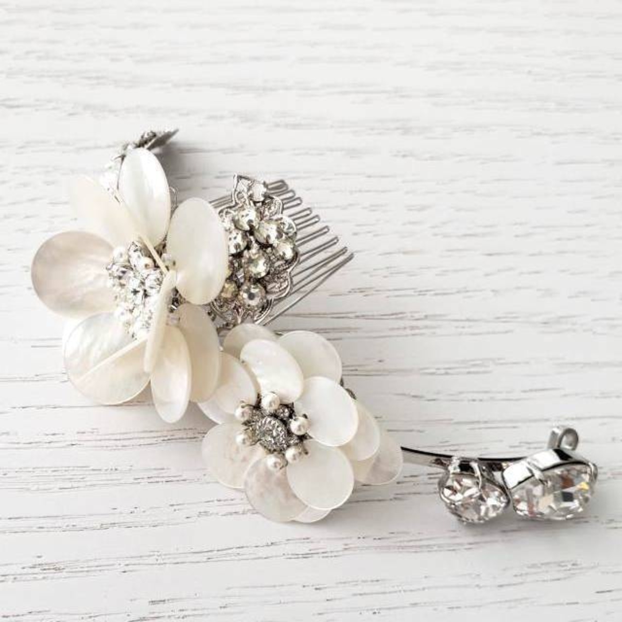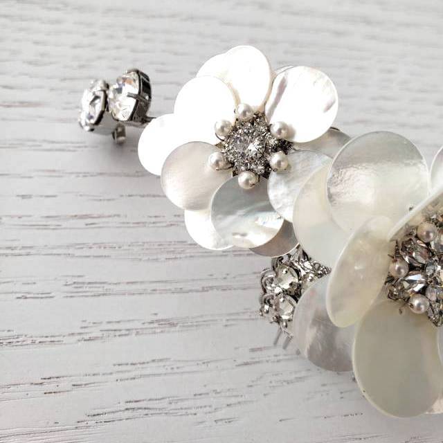 エリザベスバウアーのマザーオブパール(真珠を生み出す白蝶貝等の貝殻)で作られたヘッドドレス。大粒ビジューの華やかさとシェルのフォーマル感を持ち合わせた華やかなたヘッドアクセサリー。