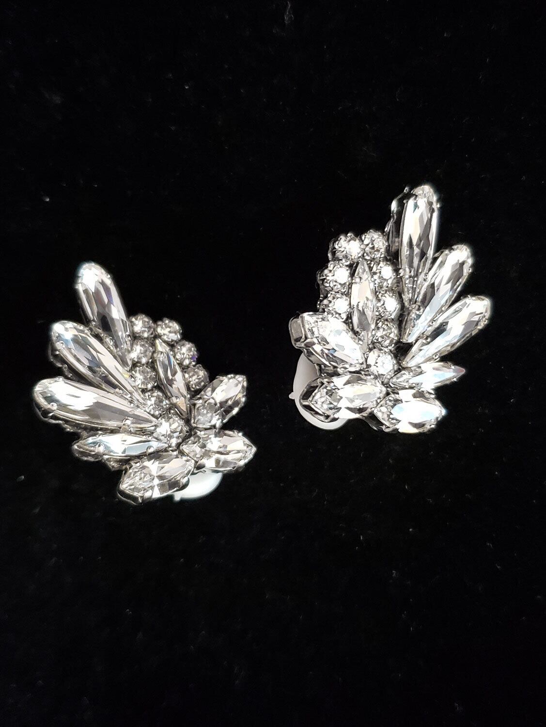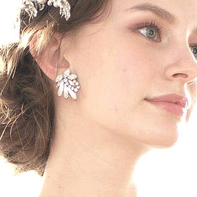 花嫁に人気のクリスタルのビジューイヤリング。上品さと華やかさを兼ね備えたイヤリング。リーフのデザインに、輝くビジューが存在感のあるイヤリングは、特別な日だけでなく、普段のコーディネートにも。